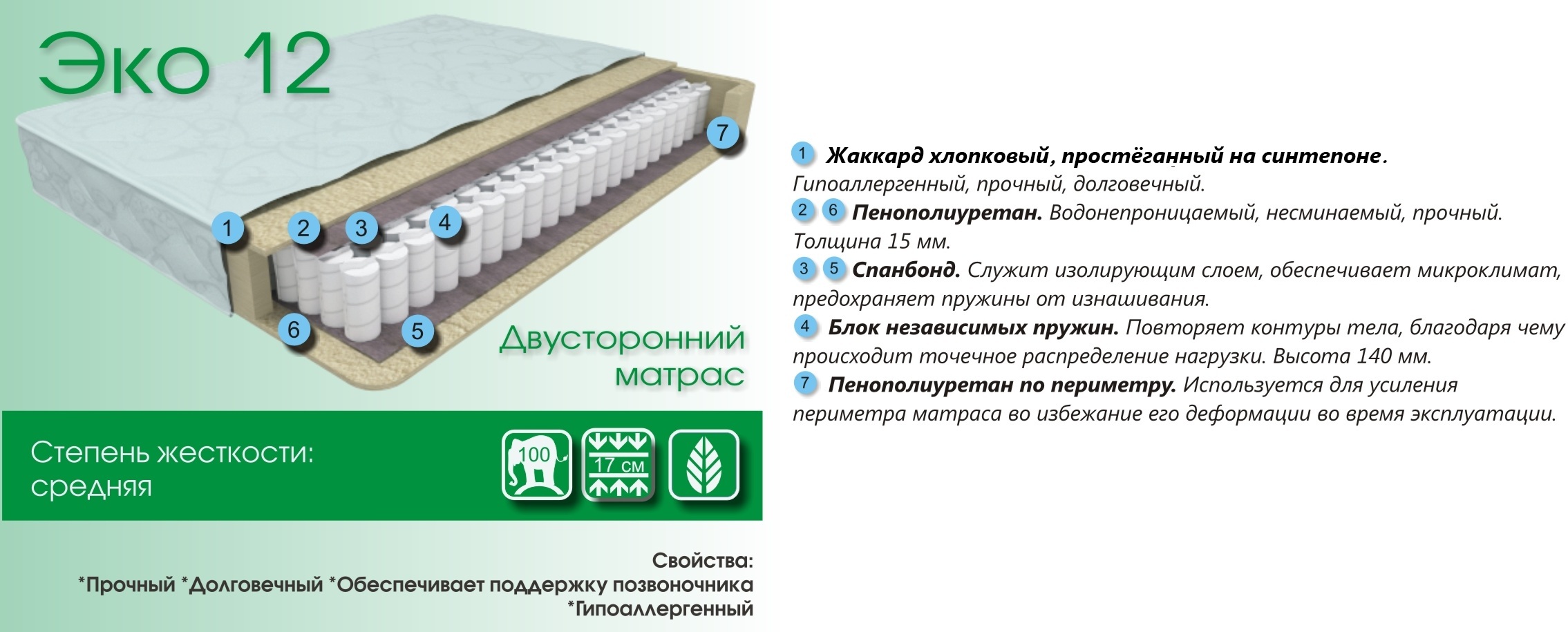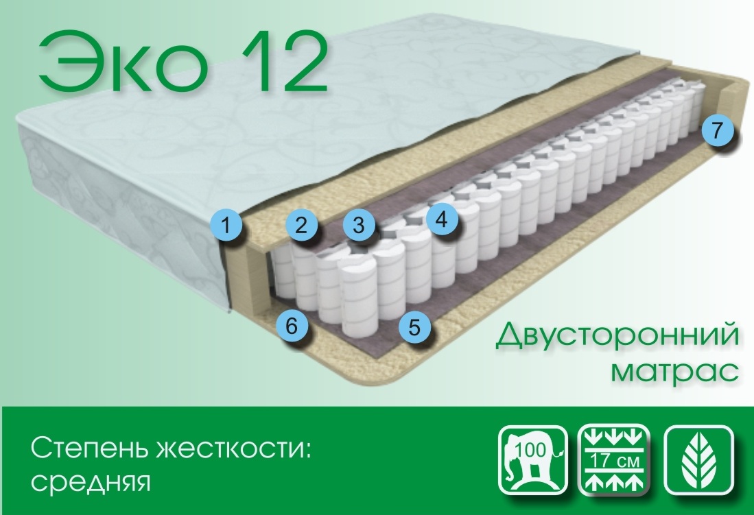 Эко 12 - средняя жесткость. Это матрас является самым простым и долговечным. Обеспечивает поддержку позвоночника и абсолютно Гипоаллеренный.