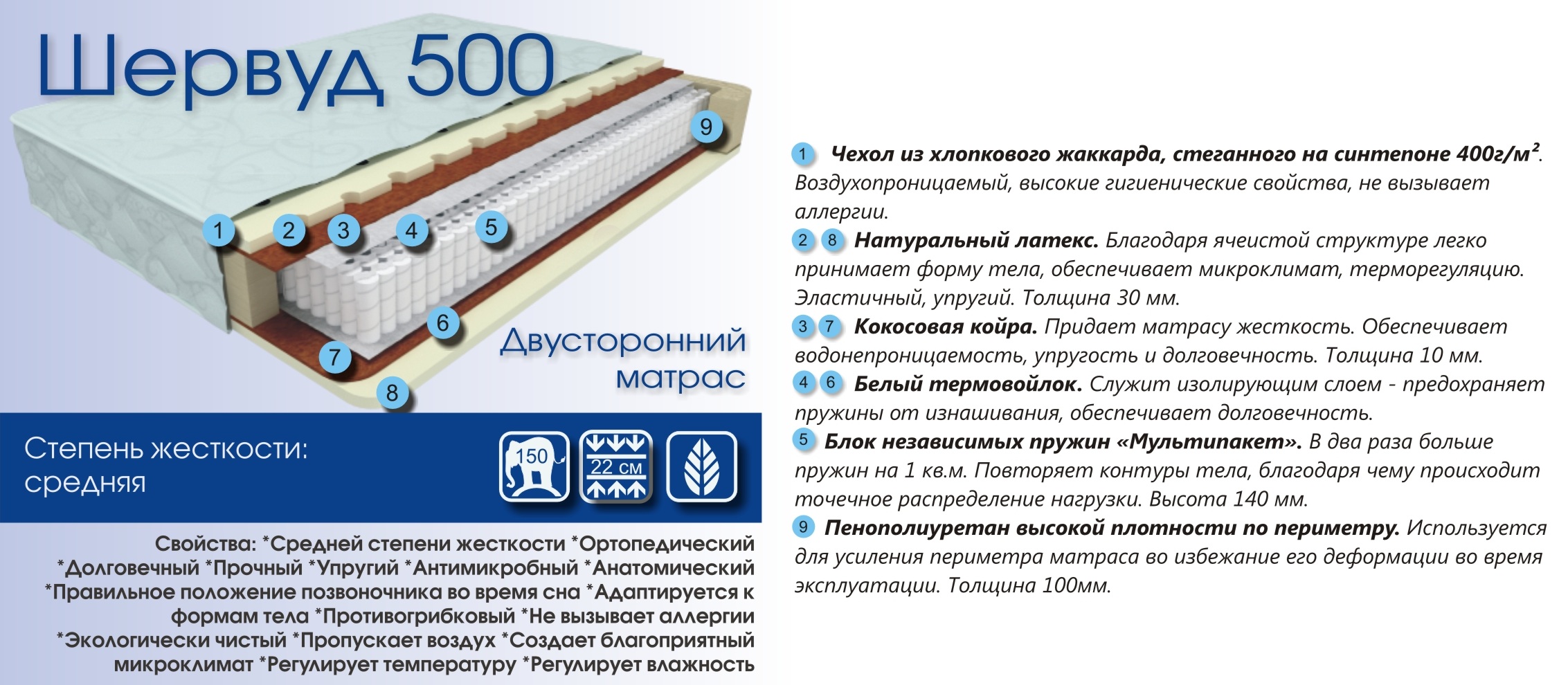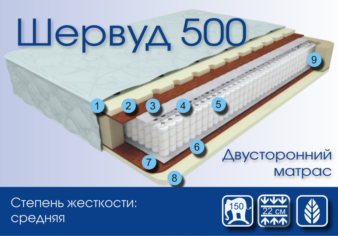 Шервуд 500 - комбинированный матрас средней жесткости Шервуд 500 изготовлен на основе пружинного блока "Мультипакет". Уникальный пружинный блок "Мультипакет" идеально адаптируется к формам Вашего тела, а его сочетание с натуральными материалами дарит Вам максимальное расслабление, а вместе с тем - здоровый отдых. Кокосовая койра придает необходимую жесткость матрасу, а латекс - эластичность, при этом прекрасно сохраняя ортопедические свойства Шервуд 500.